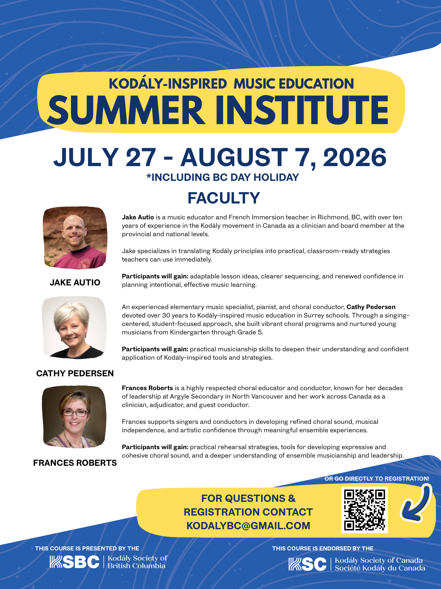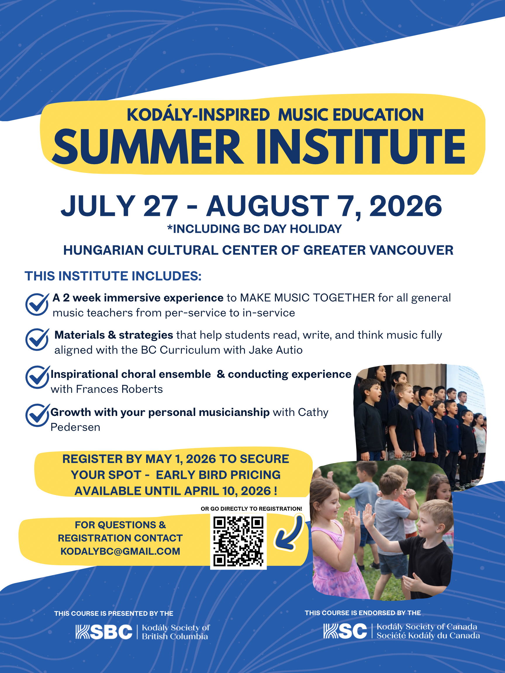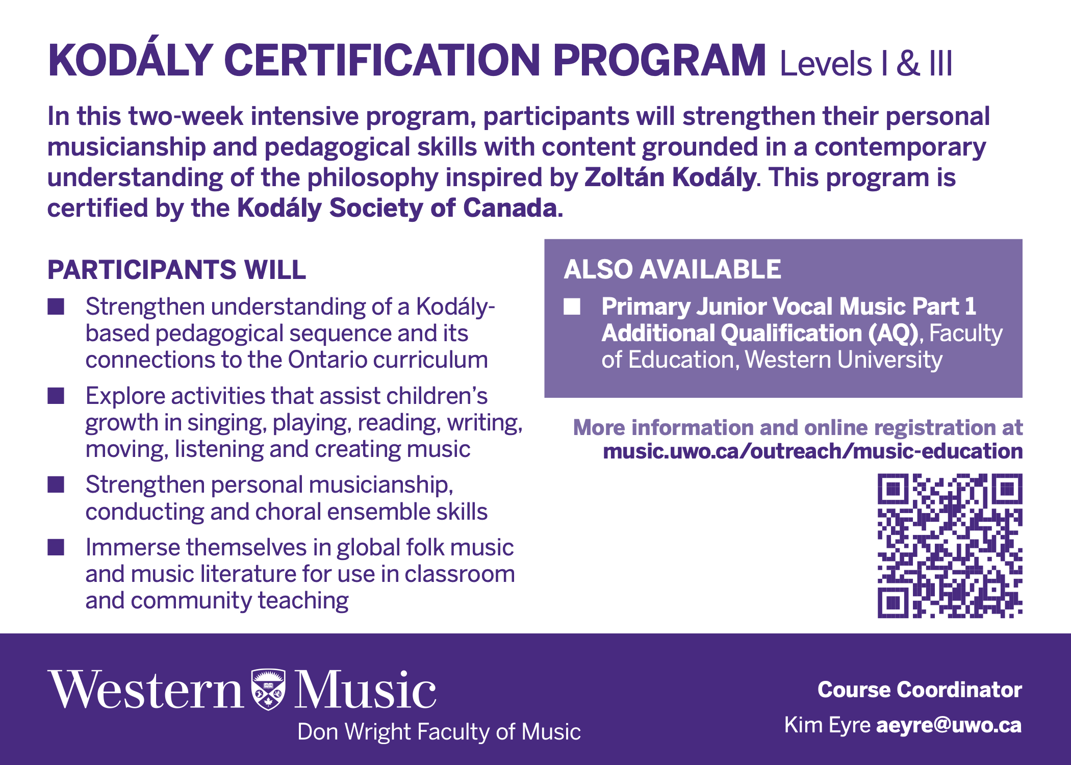 Summer Courses For registration and course information, click the relative poster. LEARN ABOUT AVAILABLE SCHOLARSHIPS HERE Edmonton, AB University of Alberta London, ON Western University Vancouver, BC Kodály Society of British Columbia Halifax, NS Kodály Society of Nova Scotia